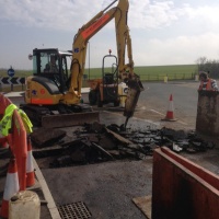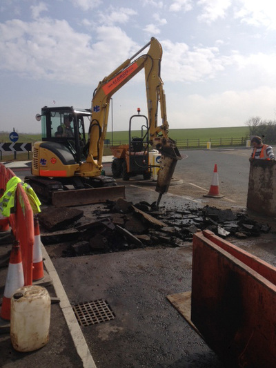 Preparing the road for Tesco Supermarkets. 5 Tonne excavator with pecker to break the old road in preparation to lay the new tarmac road.